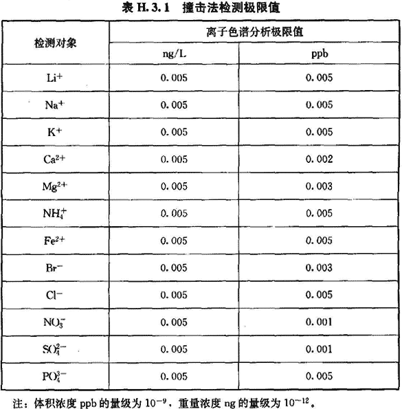 H.3.1 撞擊采樣法適用于檢測空氣中的陰陽離子(Li+、Na+、K+、Ca2+、Mg2+、Fe2+、Br-、Cl等)的濃度。檢測限值可按表H.3.1執(zhí)行。