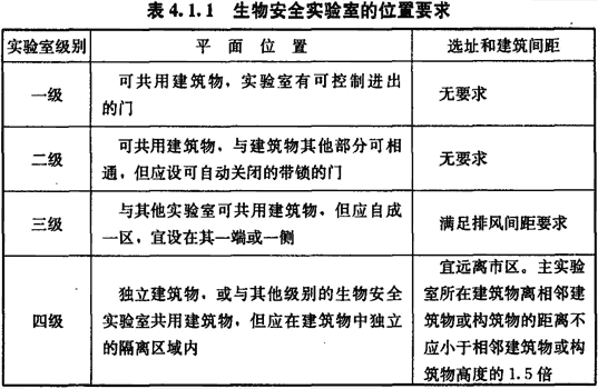 4.1.1 生物安全實驗室的位置要求應符合表4.1.1的規(guī)定。