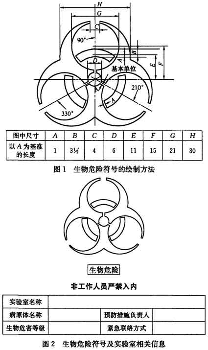 4.2.8 二級(jí)、三級(jí)、四級(jí)生物安全實(shí)驗(yàn)室的操作對(duì)象都不同程度地對(duì)人員和環(huán)境有危害性,因此根據(jù)國(guó)際相關(guān)標(biāo)準(zhǔn),生物安全實(shí)驗(yàn)室入口處必須明確標(biāo)示出國(guó)際通用生物危險(xiǎn)符號(hào)。生物危險(xiǎn)符號(hào)可參照?qǐng)D1繪制。在生物危險(xiǎn)符號(hào)的下方應(yīng)同時(shí)標(biāo)明實(shí)驗(yàn)室名稱、預(yù)防措施負(fù)責(zé)人、緊急聯(lián)絡(luò)方式等有關(guān)信息,可參照?qǐng)D2。